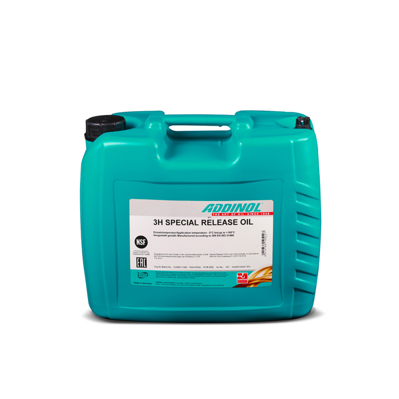 Addinol 3H Special Release Oil เป็นกลางทั้งในด้านกลิ่นและการทดสอบ ไม่มีสี โปร่งใส ได้รับการรับรอง มีความปลอดภัย เมื่อสัมผัสอาหาร มีประสิทธิภาพในการหล่อลื่นโดยเฉพาะอย่างยิ่ง พื้นผิวเคลือบ PE