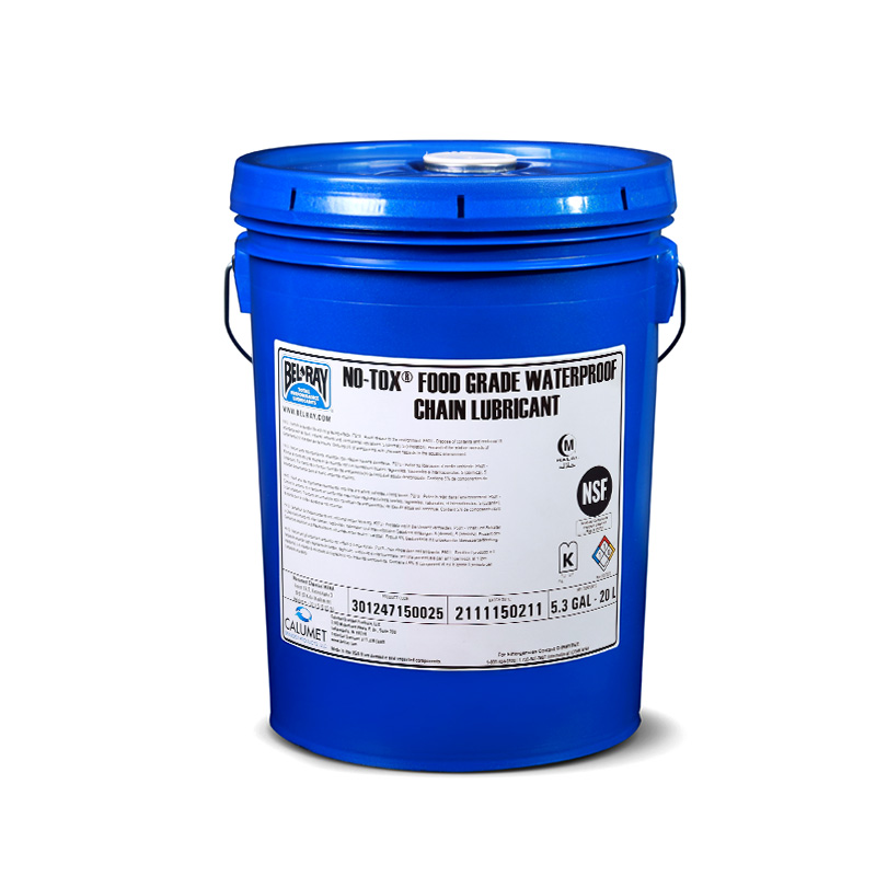 No-Tox® Waterproof Chain Lubricant น้ำมันหล่อลื่นโซ่ฟู้ดเกรดชนิดฟิล์มเหนียวและกันน้ำ เป็นตัวเลือกที่เหมาะสมสำหรับโซ่ที่สัมผัสน้ำตลอดและความร้อนไม่สูง เพิ่มการหล่อลื่นและแทรกซึมในทุกส่วนของโซ่ เช่น เฟือง ข้อต่อ หมุด และบูชในอุตสาหกรรมอาหารและเครื่องดื่ม